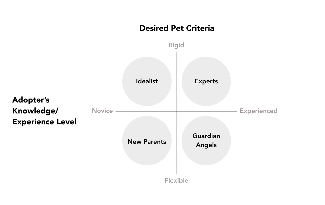 Through surveys and in-depth interviews with potential adopters, we discovered multiple traits and factors influencing how people search for pets. Two core parameters emerged: